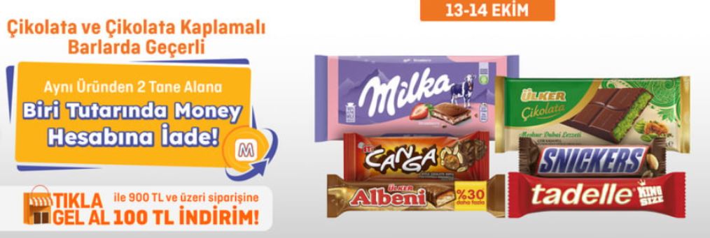 13-14 Ekim tarihleri arasında geçerli olan kampanyada, çikolata ve çikolata kaplamalı barlar ön planda. Migros müşterileri, aynı üründen iki adet aldıklarında biri tutarında Money puanı geri alacak. Kısacası “iki öde, bir iade” formülüyle tatlı keyfi artık daha avantajlı hale geliyor. Kampanya, stoklarla sınırlı olup yalnızca Migros Money Club üyelerine özel olarak uygulanıyor.